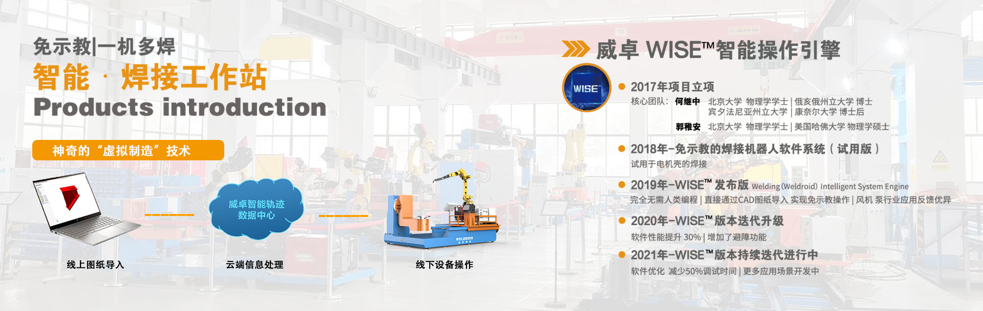 無錫威卓智能機器人有限公司成立于2017年,是無錫市政府引進(jìn)的科技領(lǐng)軍型高新技術(shù)企業(yè),公司研發(fā)團(tuán)隊80余人,我們堅持自主創(chuàng)新,利用自主開發(fā)的虛擬制造技術(shù)對傳統(tǒng)焊接行業(yè)進(jìn)行升級改造。 公司主推的工業(yè)風(fēng)機系列-智能焊接工作站產(chǎn)品,具有免示教、實時跟蹤、簡易工裝、傻瓜式操作等優(yōu)點,真正幫助企業(yè)解決了招焊工難,用工成本高,焊接質(zhì)量不穩(wěn)定等問題。